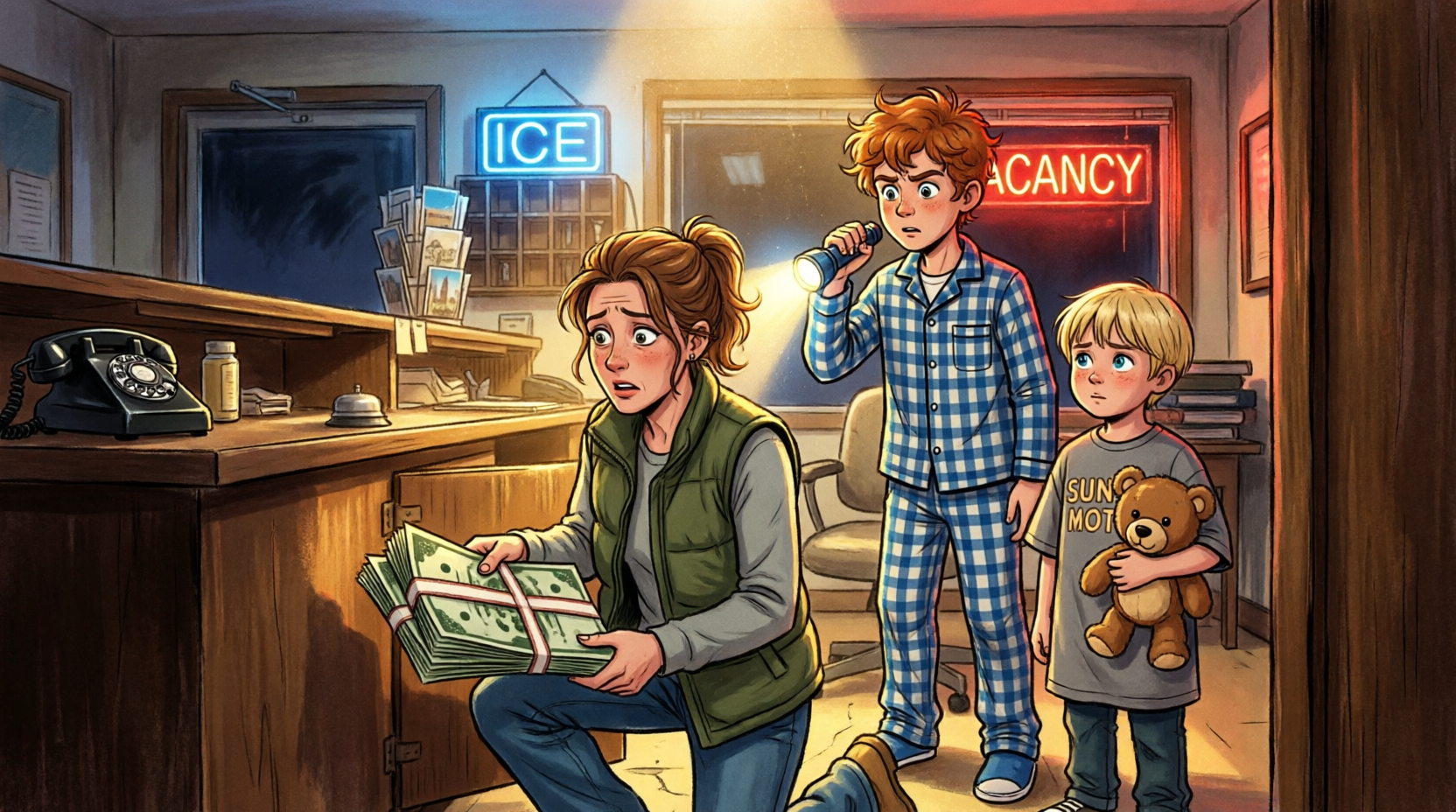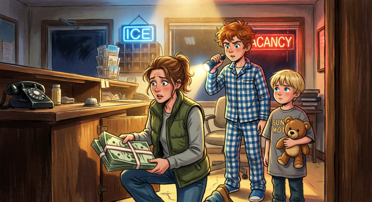 One night he came to the motel office after the boys were asleep. The sign outside buzzed. Rain tapped against the window. He stood in the doorway with both hands in his coat pockets and said, “Can we talk?”