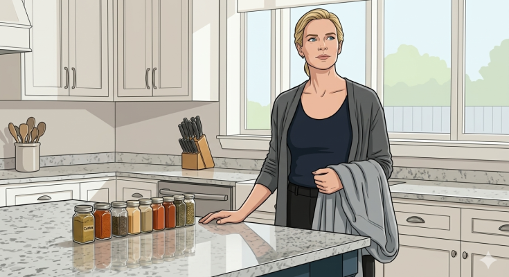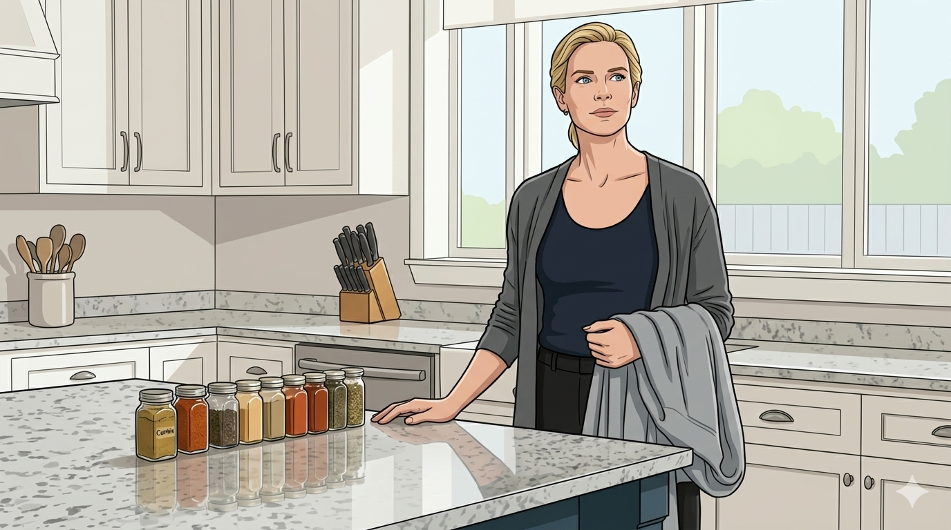 My kitchen is exactly as I want it now. The spice jars are back in the order I prefer. My knives are on their magnetic strip. The cardigan is in the closet where it belongs. The quartz countertops, which I chose myself from a sample board on a Saturday afternoon three years ago, are wiped down and clear.