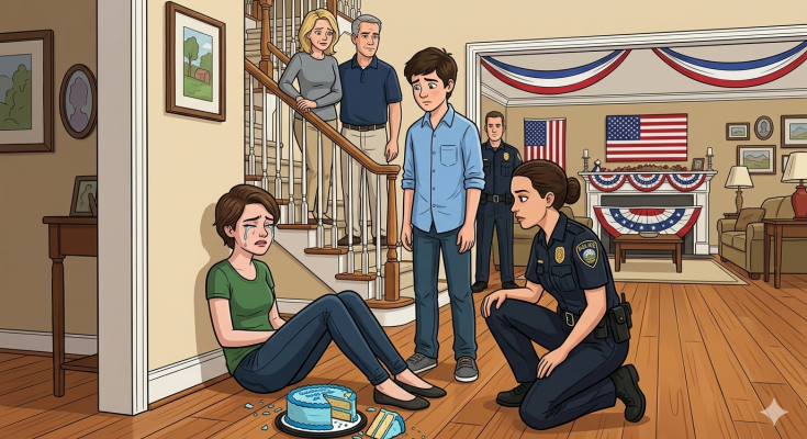 The sickening crack of my spine against the basement stairs echoed through the house, but it was nothing compared to the cold silence that followed. I lay there sprawled at the bottom, staring up at my brother Jake’s smirking face. My sixteenth birthday cake for him lay splattered beside me, blue frosting smeared across the concrete like evidence of something broken beyond repair.