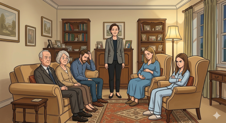 My husband’s whole family gathered in my living room and insisted that I leave the house after his affair resulted in a pregnancy. I didn’t speak up. I refrained from arguing. I just grinned and uttered a single sentence, and I saw the self-assurance vanish from each of their six faces. Shortly after, they apologized, but it was meaningless at that point.