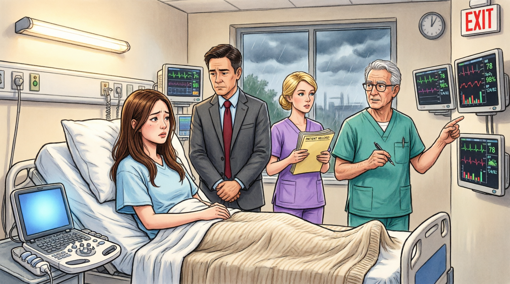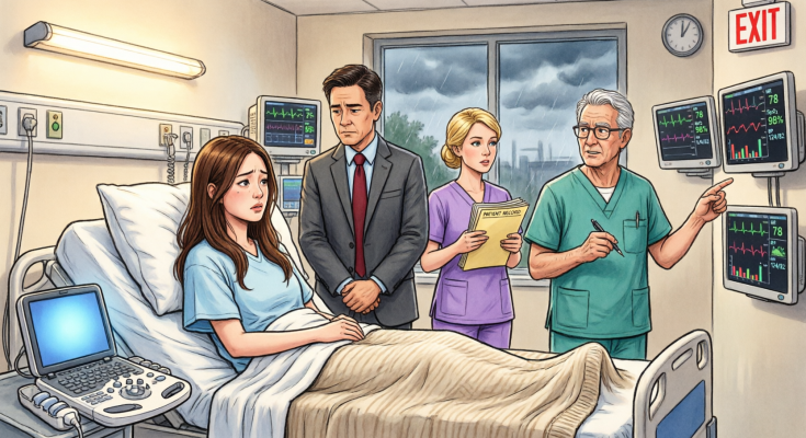 I don’t know what he saw first. My face. The pattern on the monitor. The shape of my chest rising too fast under the hospital gown. But something changed in his expression. Not alarm exactly. Recognition.
