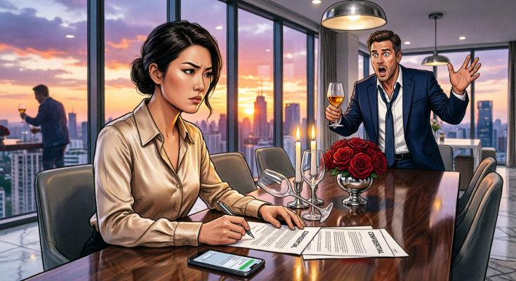When I walked into the apartment, everything was exactly as he’d described. The papers sat neatly on the dining table beside a polished pen. Kevin stood by the kitchen island in a blazer he only wore when he wanted to impress. A bottle of champagne chilled in ice.