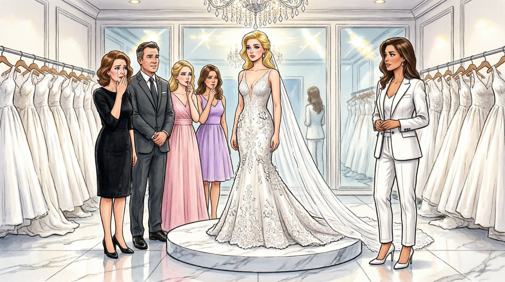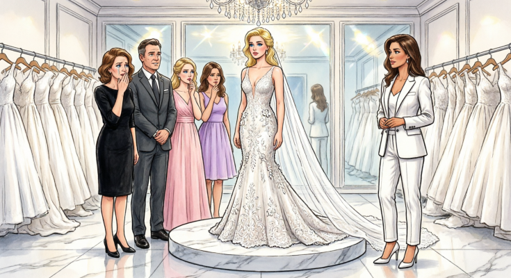 The bridal salon on Madison Avenue went so quiet that I could hear the whisper of satin as a consultant behind me shifted her weight. Someone near the veil display inhaled sharply. A woman I had never met lowered the crystal flute in her hand halfway to her mouth and stared at me with open pity. Even the music—some soft instrumental arrangement of an old love song—seemed suddenly too loud, too intimate, too mocking.