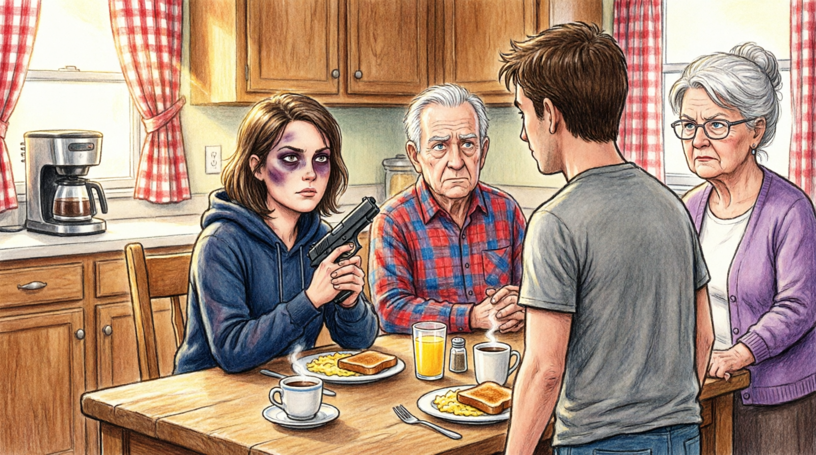 The heater hums. The biscuits cool. Orange light from the stove clock reads 7:32. It occurs to you then, almost absurdly, that if this were any other school morning you would already be checking backpacks, packing lunches, braiding Emily’s hair. The thought hits like a blow because it reminds you how long you have tried to tuck violence neatly around domestic routine, to keep the machine of family life running while pretending some of its gears were not grinding flesh.