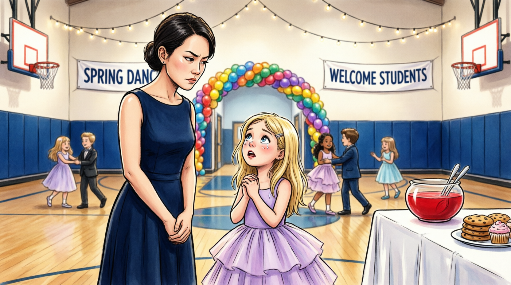 The gym had been transformed as much as a school gym can be. Crepe paper streamers hung from basketball hoops. Balloon bouquets floated from weighted ribbons tied to folding tables draped in white plastic cloths. Someone had strung fairy lights around the bleachers, and on the far side of the room a DJ booth with a rented speaker system blinked in soft blue. The floors had been polished so recently that the smell of wax still mixed with the scent of powdered punch and popcorn. Little girls in satin and tulle darted through the room like bright fish. Men in suits, polos, uniforms, and one unfortunate bolo tie moved more carefully, looking either proud or mildly bewildered depending on temperament.