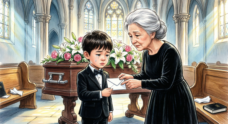 I stood beside the casket of my husband, Robert Hayes, trying to breathe through a grief so heavy it hollowed out my chest, when my eleven-year-old grandson, Ethan, approached me quietly. He didn’t meet my eyes. He just pressed a folded piece of paper into my hand and murmured so softly it almost disappeared beneath the scent of lilies and polished wood:
