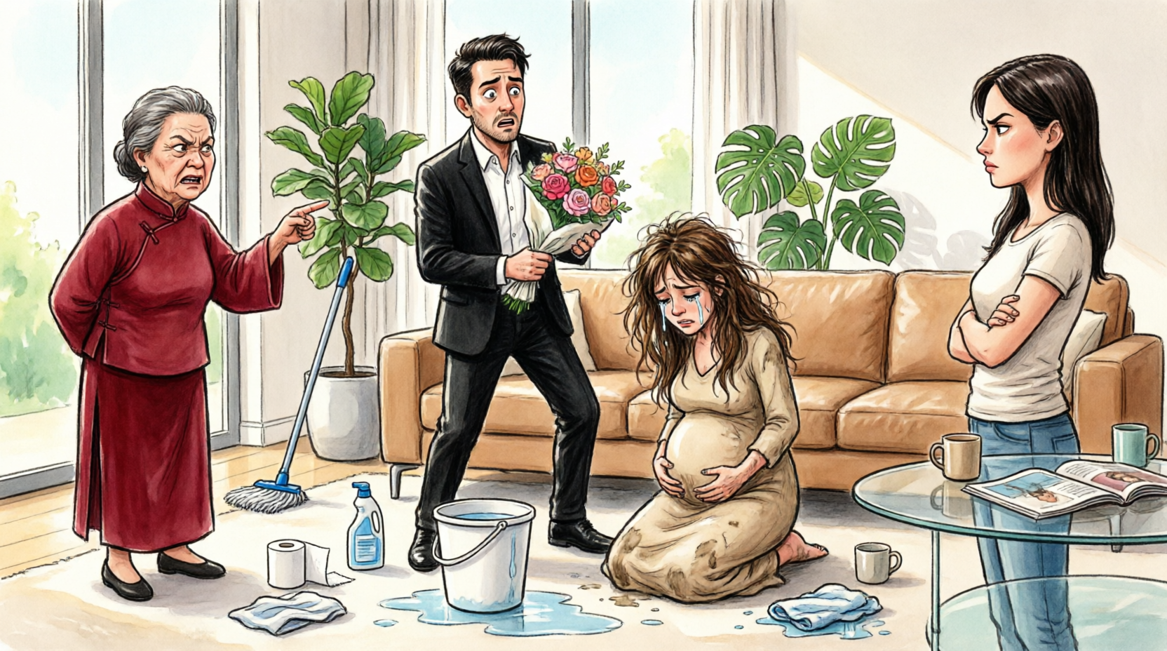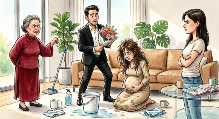 You stand in the doorway with white roses in one hand and a shopping bag full of baby clothes in the other, and the whole room seems to split down the middle. On one side is the life you thought you had built—safe, warm, carefully protected. On the other is your wife on her knees, seven months pregnant, crying so quietly it is obvious she has been punished for making noise.
